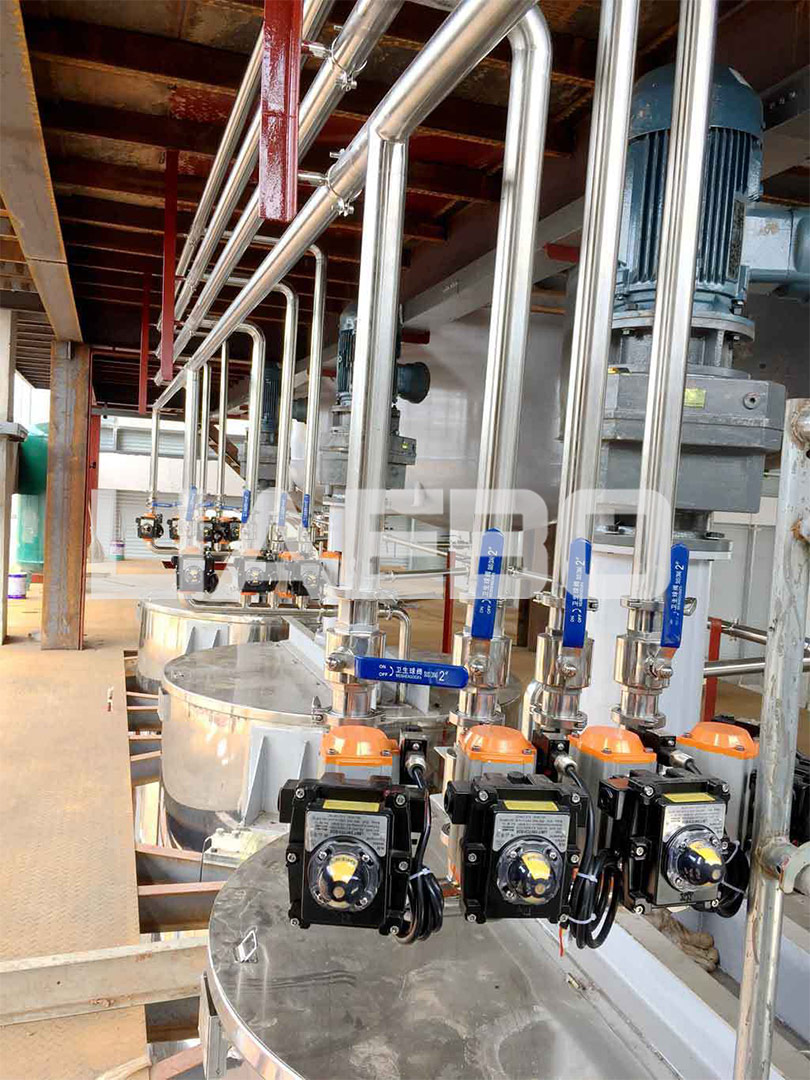 水性乙烯基高防腐涂料生產(chǎn)線,年產(chǎn)2萬(wàn)噸成品,專業(yè)電廠防腐涂料,工藝要求高,生產(chǎn)過(guò)程對(duì)溫度、分散力度都有特別的要求,設(shè)備設(shè)計(jì)附加分散盤釜內(nèi)升降,滿足不同層面固液混合需求,解決分散不均衡的問(wèn)題。自動(dòng)配料、粉體隔層投放、釜蓋密封設(shè)計(jì),解決了配料、品質(zhì)、環(huán)保、安全等一系列重要問(wèn)題。