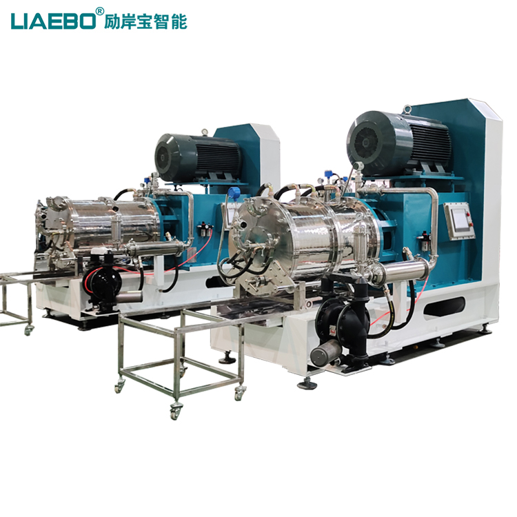 采用循環(huán)研磨工藝,環(huán)保節(jié)能、勞動(dòng)強(qiáng)度小。配制好的原始漿料,經(jīng)過第一遍粗略研磨后,泵入循環(huán)攪拌罐,經(jīng)底部泵輸送進(jìn)入納米研磨機(jī);一邊經(jīng)過研磨后送入循環(huán)罐,與未曾研磨過的物料通過攪拌機(jī)快速混亂,一邊又通過底部泵入砂磨機(jī),周而復(fù)始直到達(dá)成研磨要求。一般而言,罐的容積是砂磨機(jī)流量的1/4。采用循環(huán)研磨工藝或多次研磨工藝能使產(chǎn)能提高,產(chǎn)品顆粒級配分布得以優(yōu)化。稍加一些控制功能,可保證產(chǎn)品的可復(fù)制性及節(jié)省成本。大尺寸轉(zhuǎn)子加上筒狀縫隙式分離器,使該型設(shè)備可使用不同材質(zhì)小顆粒珠子。對于防金屬污染的物料,可采用陶瓷(碳氮化硅,氧化鋯)及聚氨酯結(jié)構(gòu)材料。