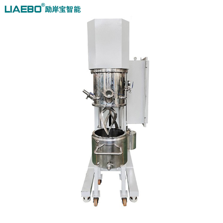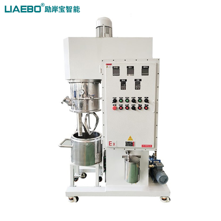 雙行星真空攪拌機是一種高性能、高效率、易清洗維護的新型攪拌設備。主要由減速電機、行星架、攪拌器、分散器、刮壁器、料桶、升降系統(tǒng)、液壓擠出系統(tǒng)以及機架等構成,設備的雙組攪拌器運行時自轉(zhuǎn)同時繞著軸心進行公轉(zhuǎn),攪拌器形式根據(jù)物料粘度和工藝特性選配,常見的包括漿葉式、麻花式、爪式、框式等,具備良好的混合、反應、捏合、溶解的作用;高速分散器由多層具備極高線速度的鋸齒狀分散盤組成,它同樣在高速自轉(zhuǎn)的同時繞著軸心進行公轉(zhuǎn),能夠?qū)⒎哿?助劑)快速的分散到漿料里,具備很強的分散作用。設備配有一組獨立刮刀,對桶壁進行不斷的刮拭,同時攪拌漿葉可以增加刮片,對料桶底部進行刮拭,避免攪拌死角,確保產(chǎn)品的穩(wěn)定性;雙行星真空攪拌機傳動采用行星齒輪傳動,有較大的輸出扭矩,適用干高溫、高固,高粘度等高難度工況;該設備采用密閉式設計,可以配合真空系統(tǒng),實現(xiàn)真空攪拌,攪拌桶也可設計帶夾套加熱,配合模溫機,實現(xiàn)恒溫攪拌功能,是市場上針對高粘度物料的分散、攪拌設備。